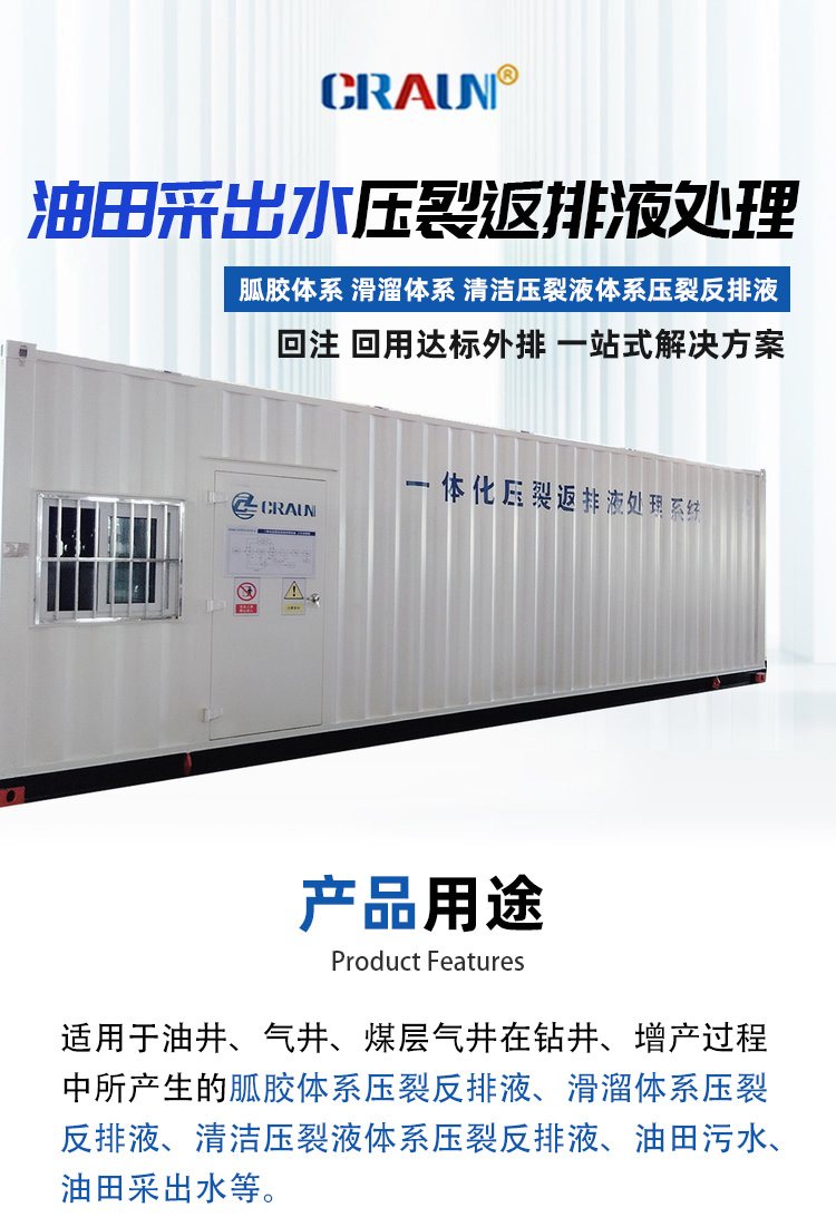 國朗裝備的壓裂返排液綜合處理技術(shù)適用于油氣增產(chǎn)過程中所產(chǎn)生的,胍膠體系壓裂返排液、滑溜水體系壓裂返排液、清潔壓裂體系壓裂返排液、油田采出水等??蓾M足回用、復(fù)用